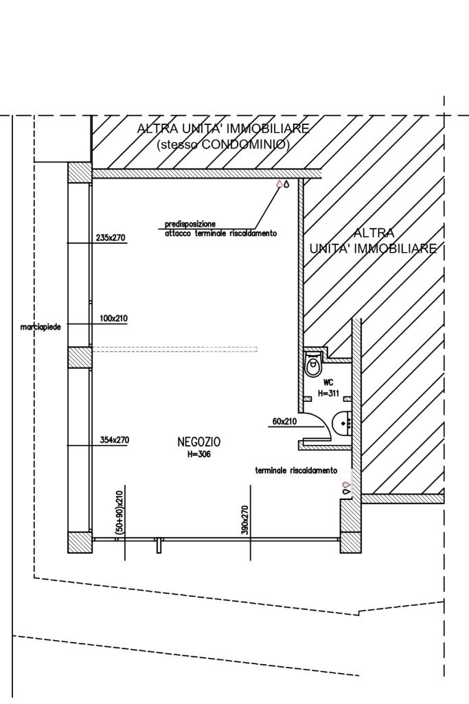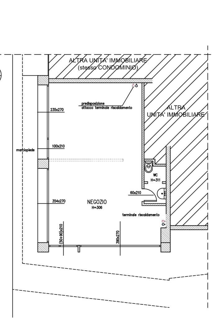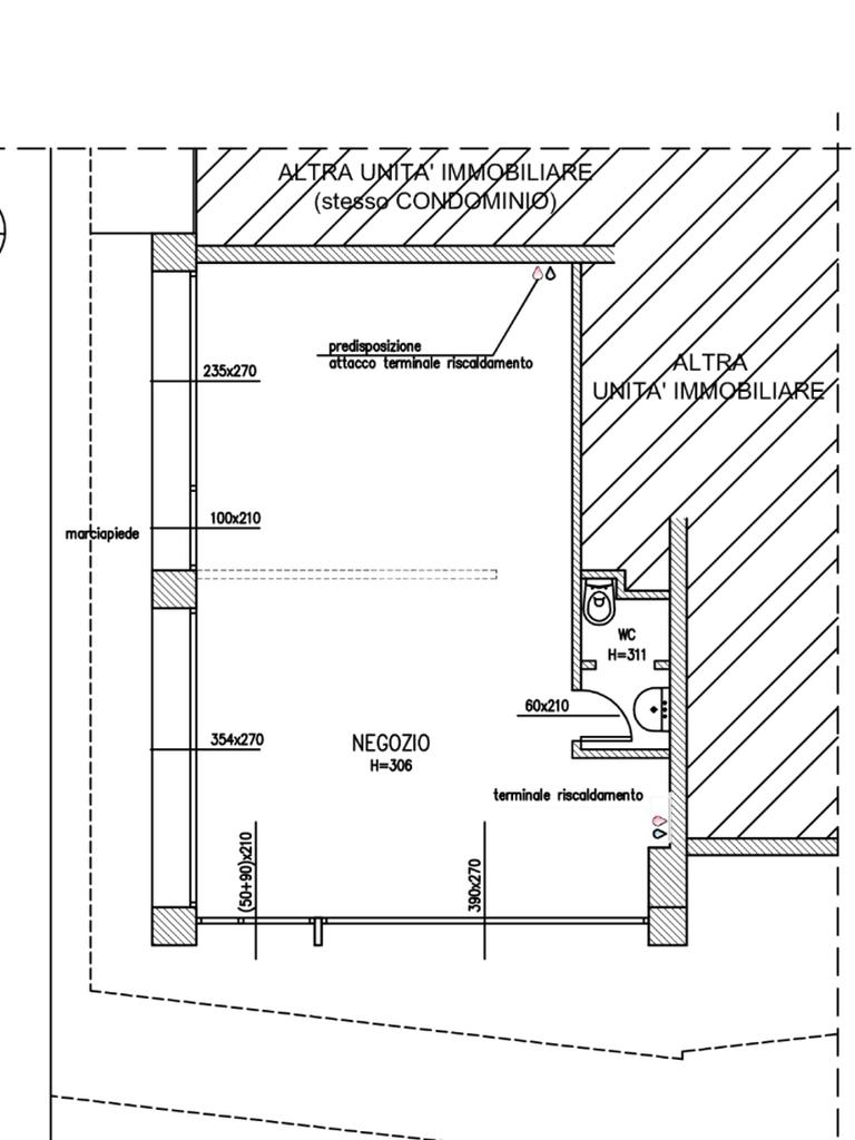 Superficie: la superficie del locale è di circa 40 mq disposta interamente su piano terra, il locale dispone di vetrine angolari affacciate sulla strada principale. Il negozio è dotato di un doppio accesso e di serrande manuali.