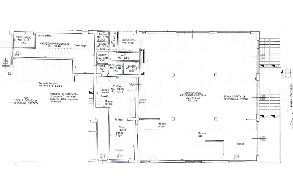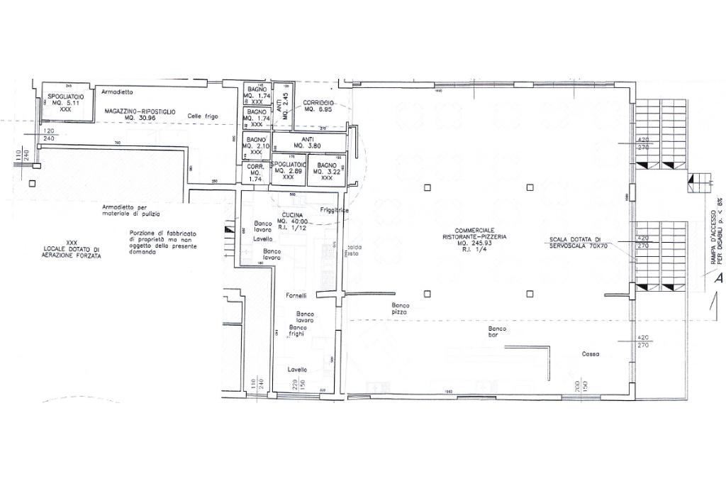 Superficie: Il locale commerciale ha una superficie di 420mq, con disponibilità fino a 150 coperti, doppio accesso pedonale, con accesso a norma disabili, cucina completa e munita forno a legna e a gas a vista e zona utilizzabile come deposito e magazzino.