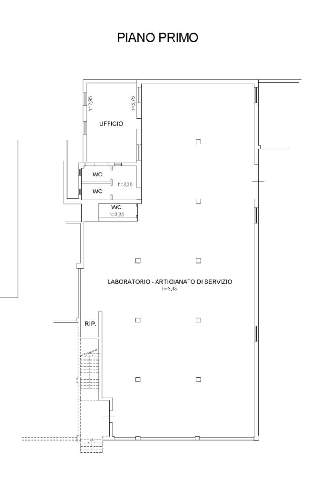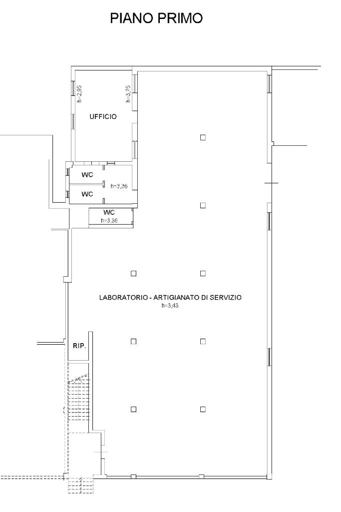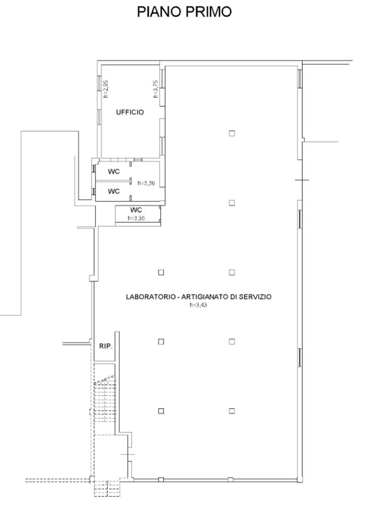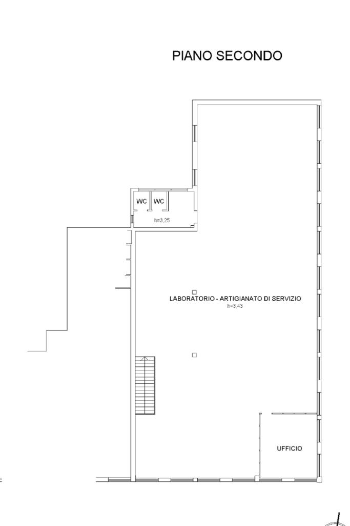- 382 mq di laboratorio artigianale al piano primo con altezza interna di 2,95 mt sotto trave e 3,30 mt al colmo, accessibile mediante scala interna e dotato di ulteriore servizio igienico e ufficio.